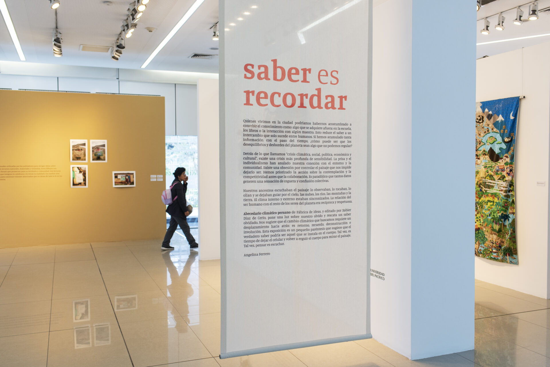 La exposición «Saber es Recordar» está concebida como un homenaje al libro Abecedario Climático Peruano, y pone de relieve el poder de las palabras para transmitir conocimientos, generar identidad y pertenencia. A la vez, fomenta un diálogo constructivo que nos permite asumir los retos locales e impulsar nuestras oportunidades globales frente a la emergencia climática.