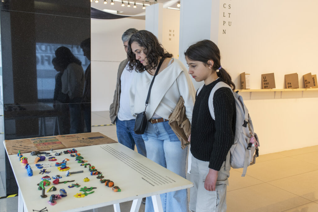 El último espacio nos acerca directamente al Abecedario climático peruano, concebido como un artefacto diseñado para detonar nuestra curiosidad. Un tendal con una selección de páginas colgadas nos invita a descubrir otras historias, personas y conocimientos. Está ideado como un espacio colaborativo que convierte la información en experiencias, donde vemos despertar la necesidad del juego y encontramos espacios para aprender, habitar y regresar. Las páginas ofrecen una selección de códigos QR que permiten conectarnos, a través de videos, con nuevos testimonios de protagonistas anóminos que nos muestran su realidad; nuestro país.