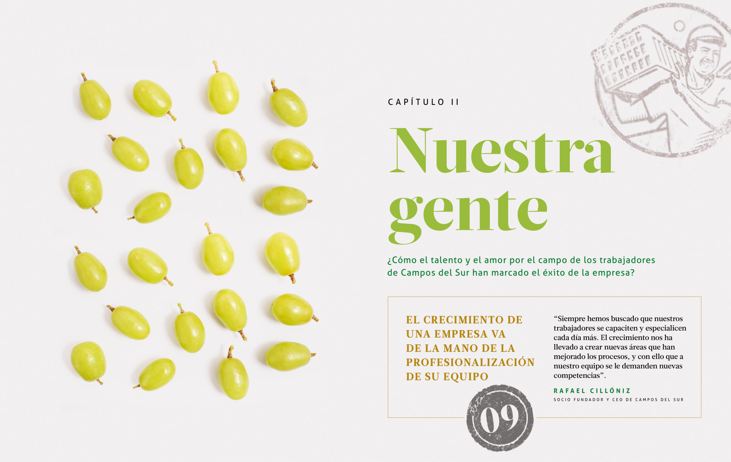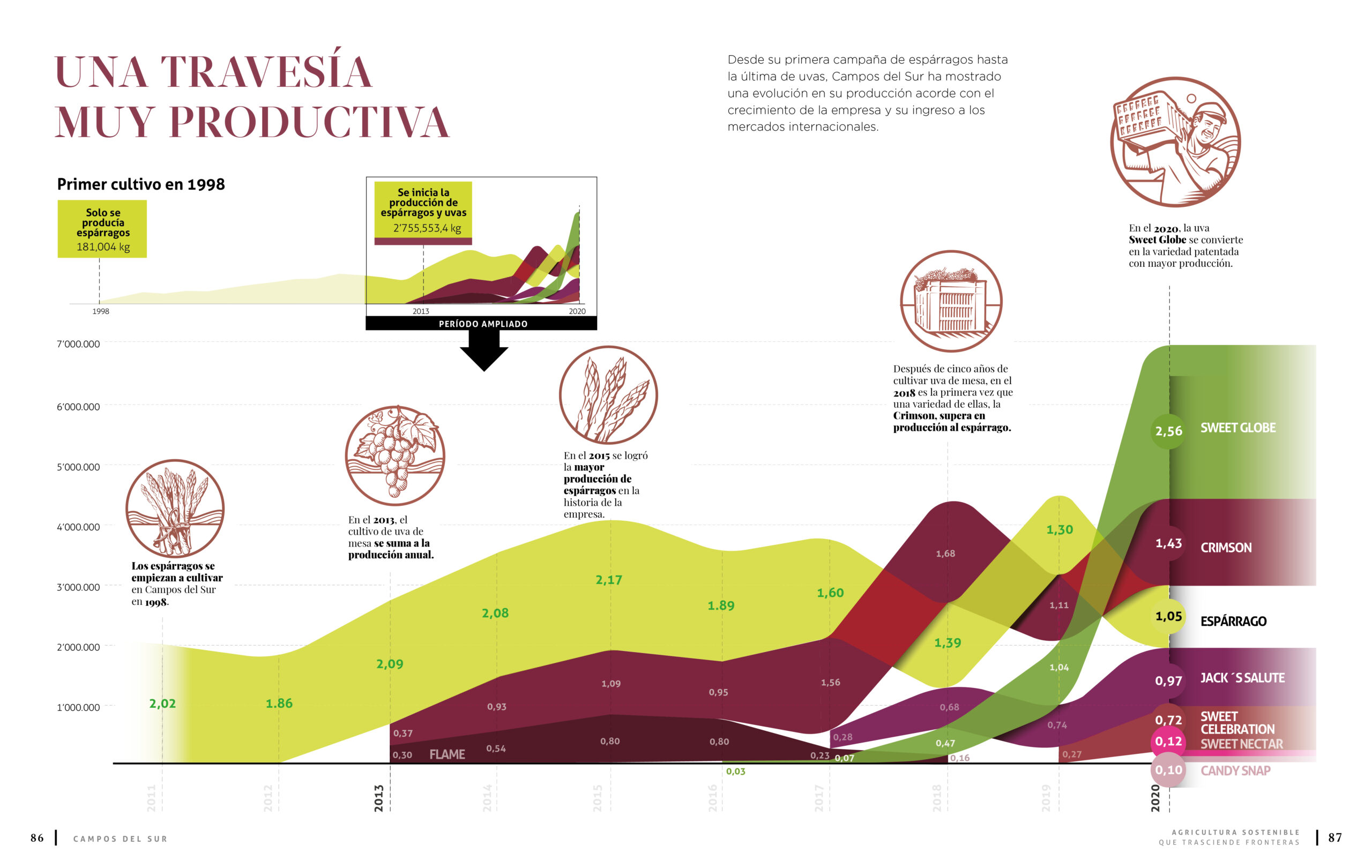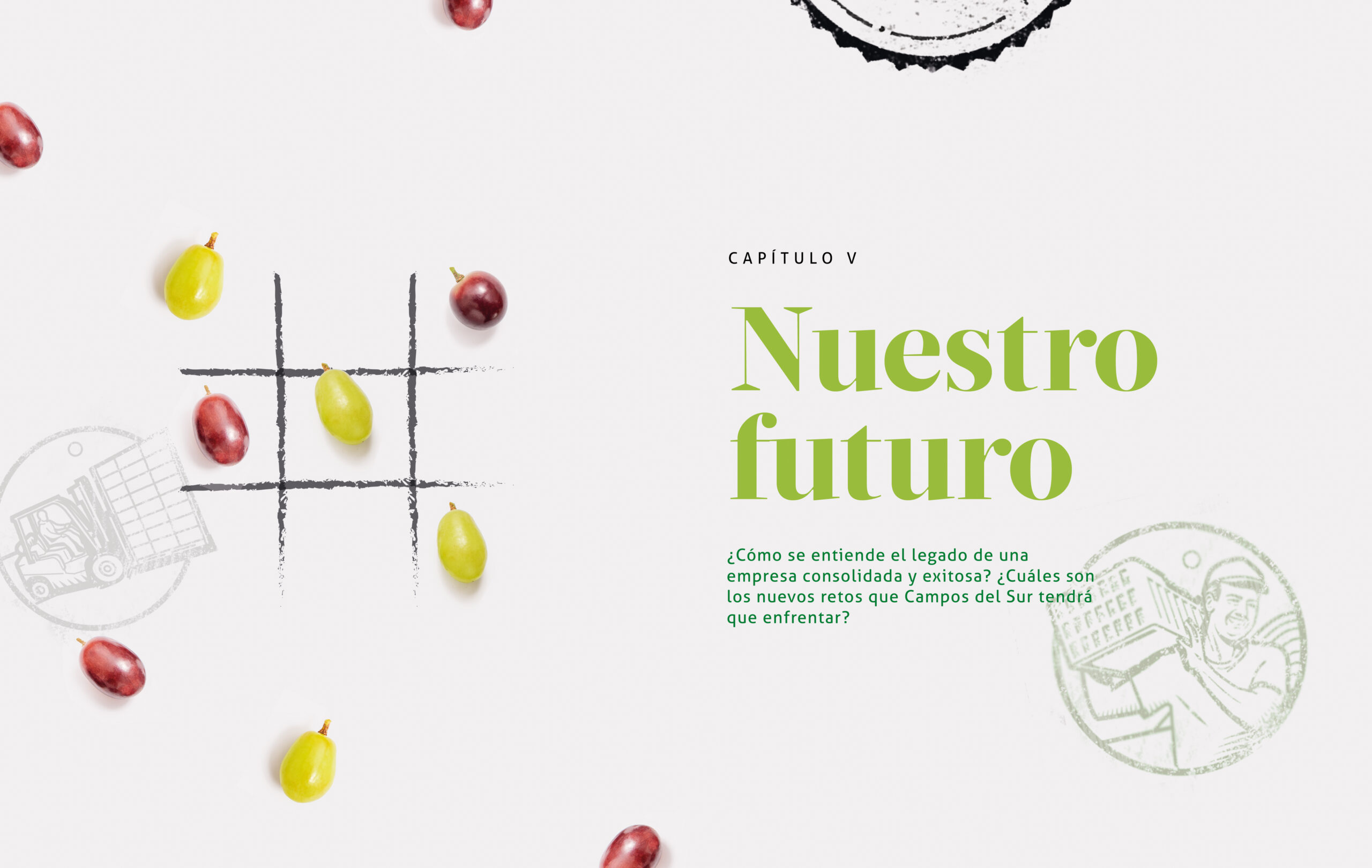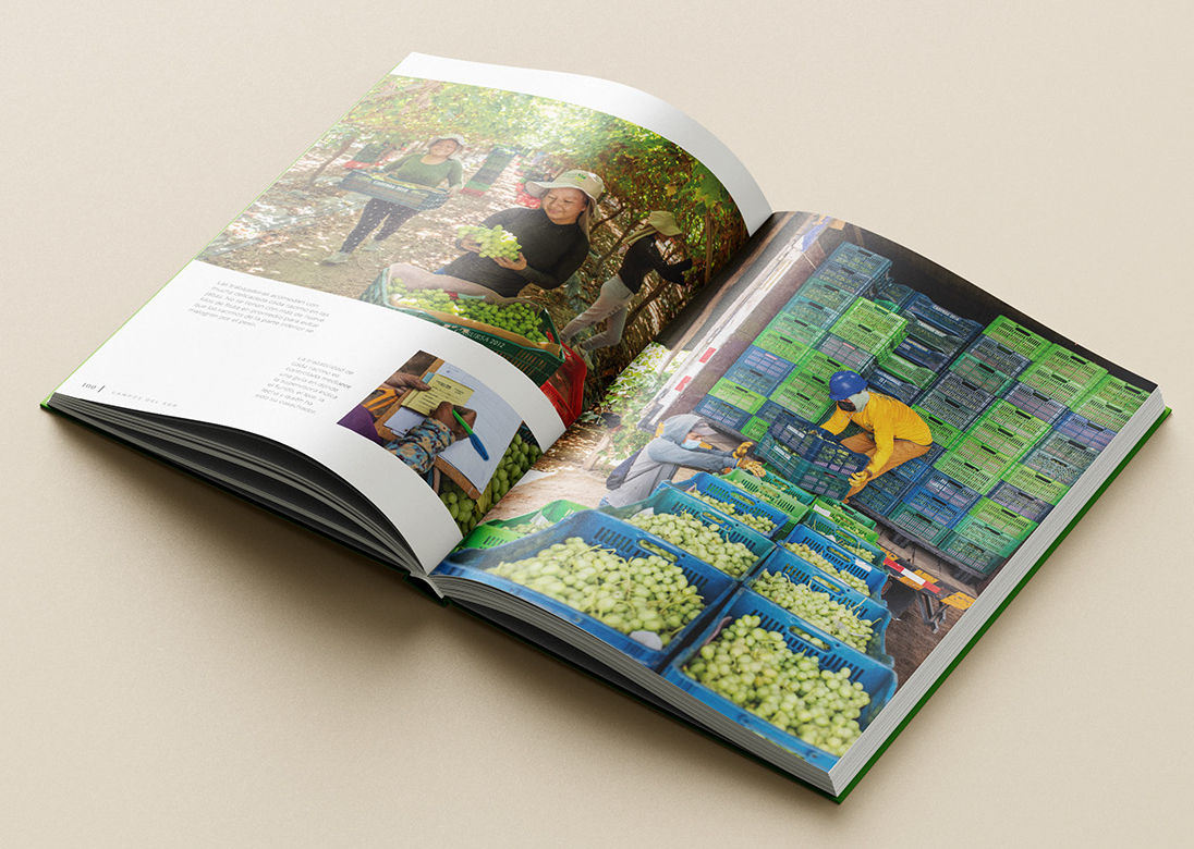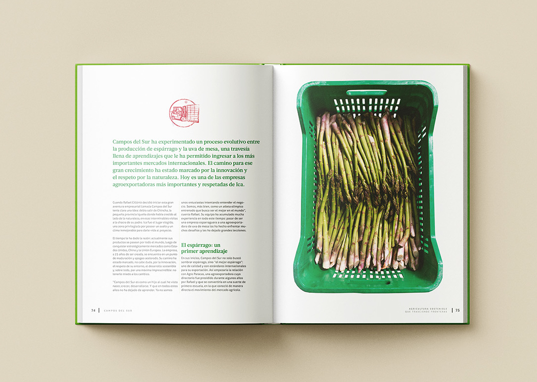 El reporteo en campo, realizado en Ica, junto con el registro fotográfico in situ de sus protagonistas y espacios de trabajo, y la recopilación de material de archivo, permitió reconstruir el recorrido de la empresa: desde sus inicios con el espárrago hasta la exportación de uva de mesa y su apertura a mercados internacionales, siempre bajo un modelo de negocio responsable.