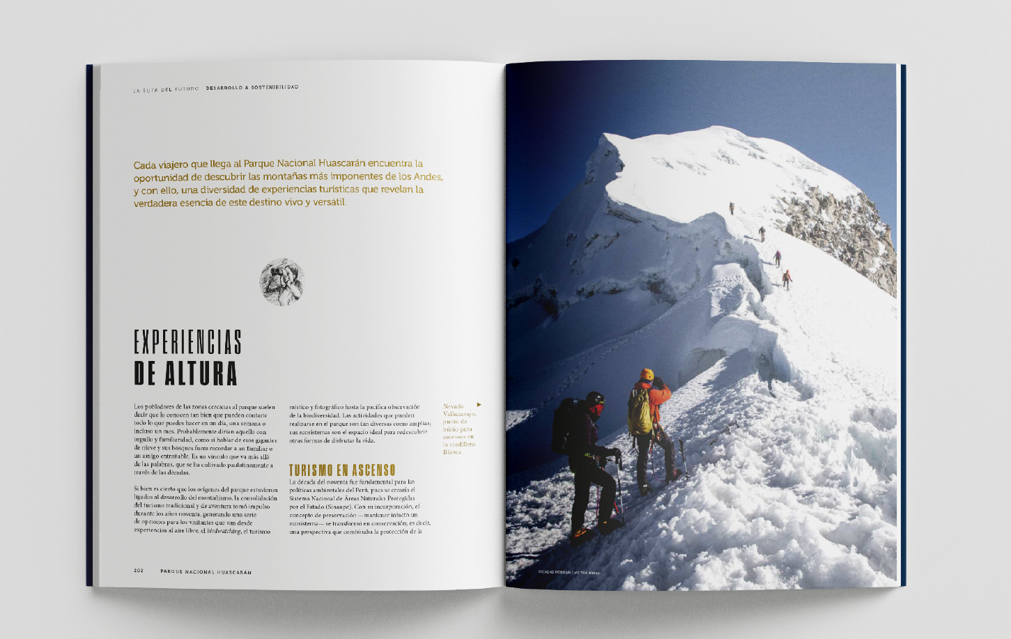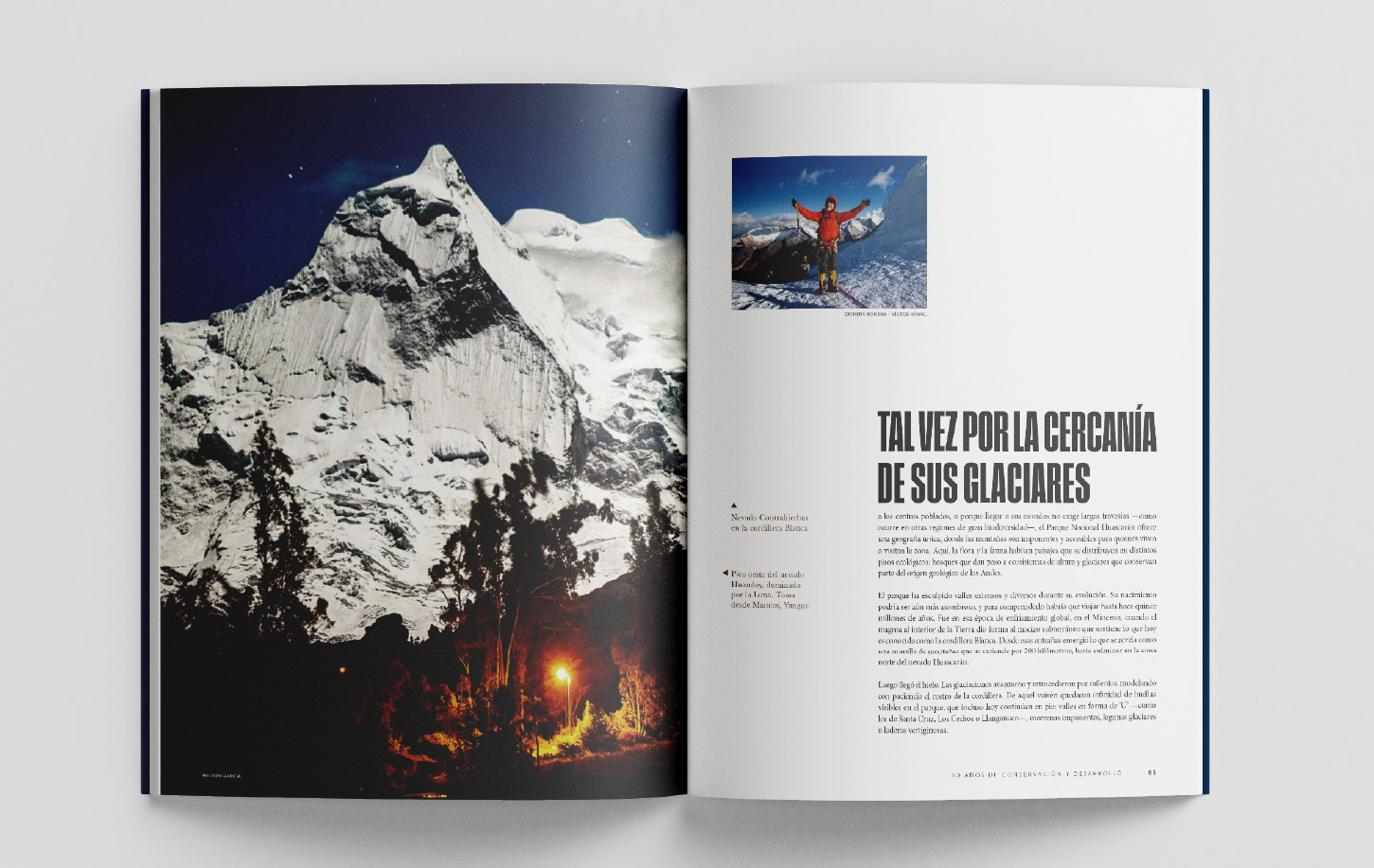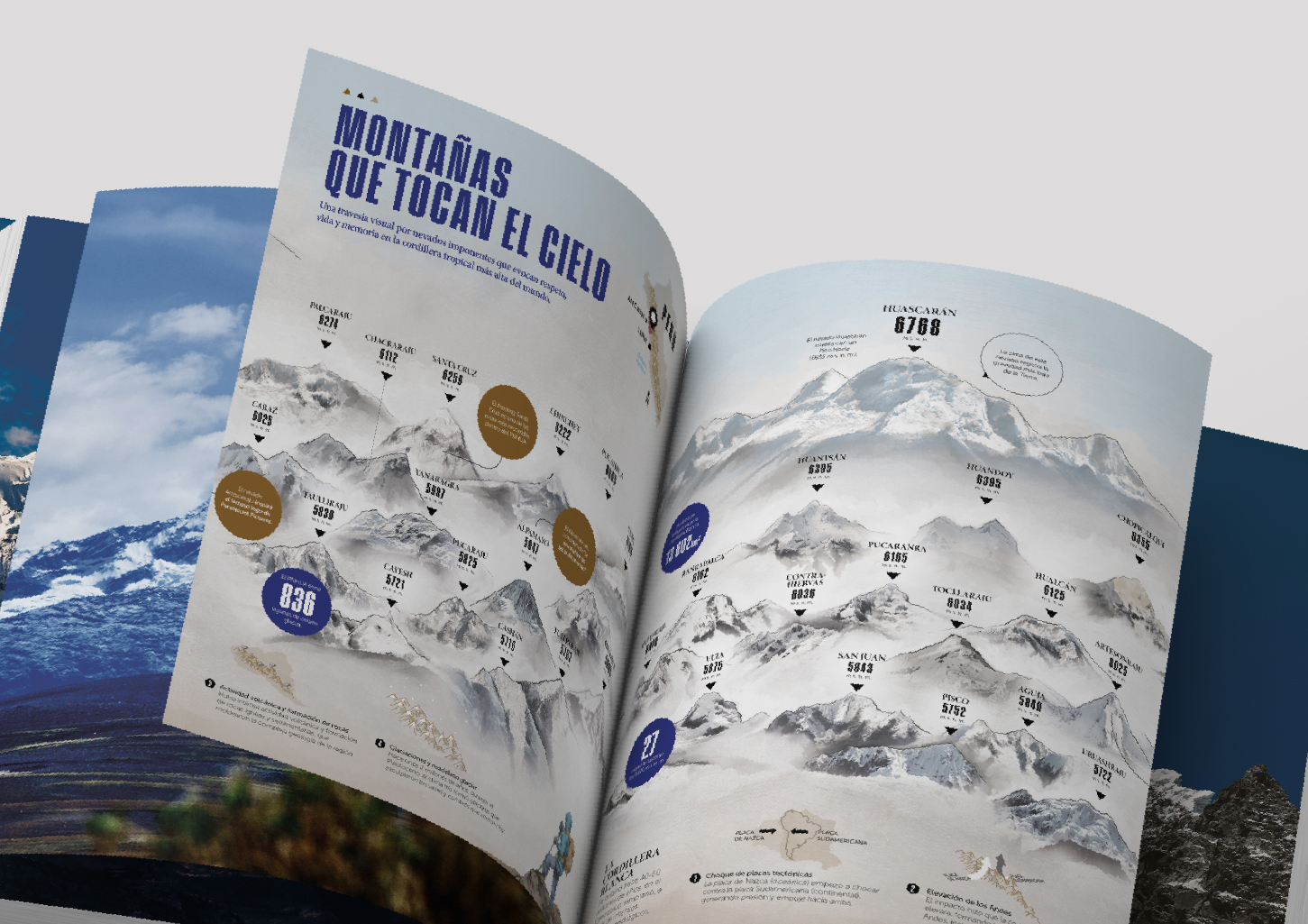 El componente textual convive con impactantes imágenes a doble página que dan a conocer la magnificencia de este espacio natural que enfrenta los desafíos del cambio climático e infografías que complementan la